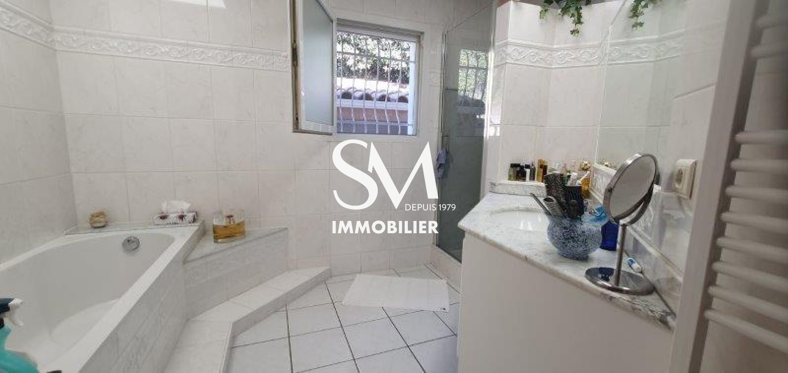 Cette villa bénéficie d'un jardin paysagé clos et arboré de 1400 m² environ avec un puits, et piscine.